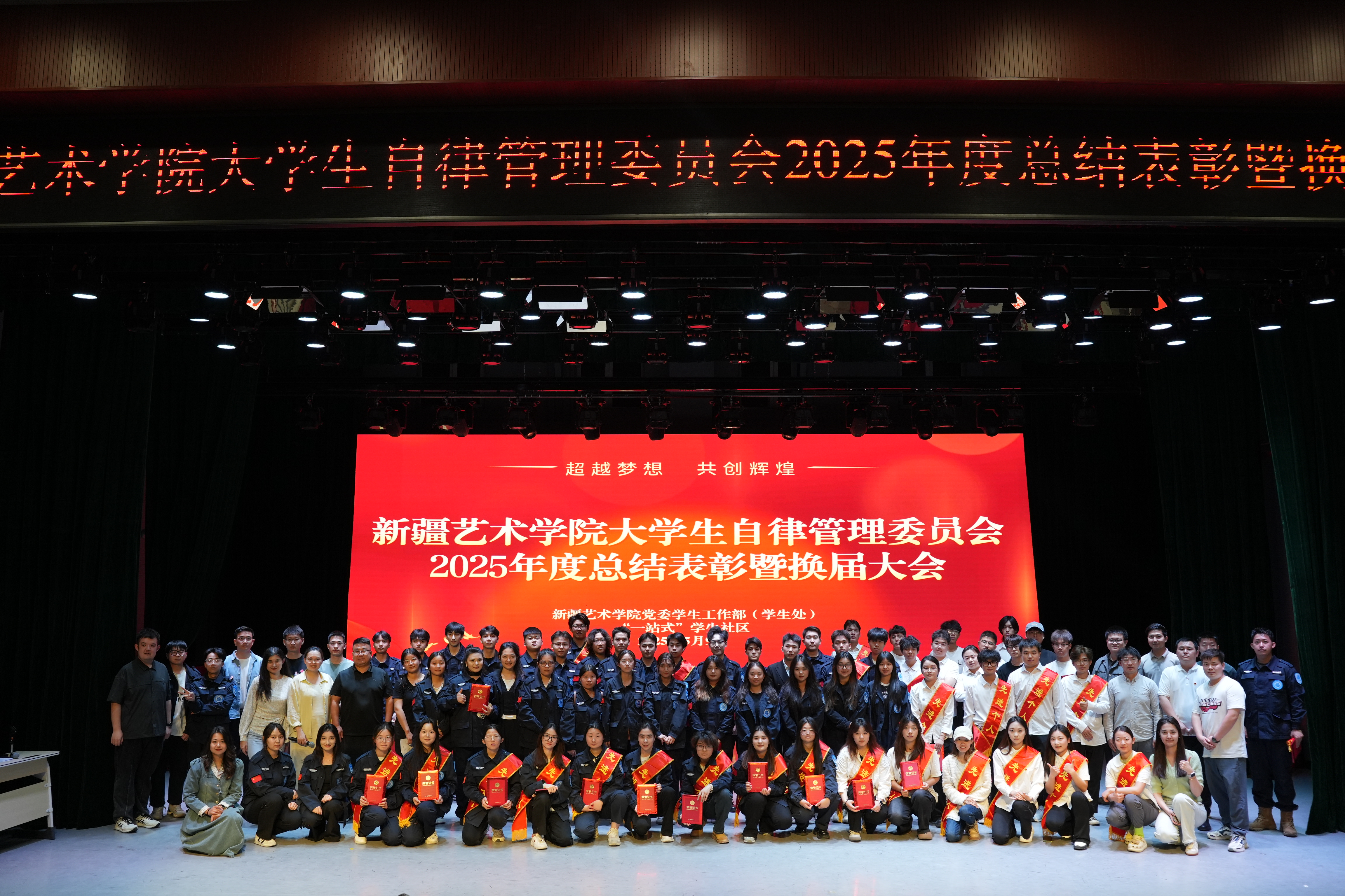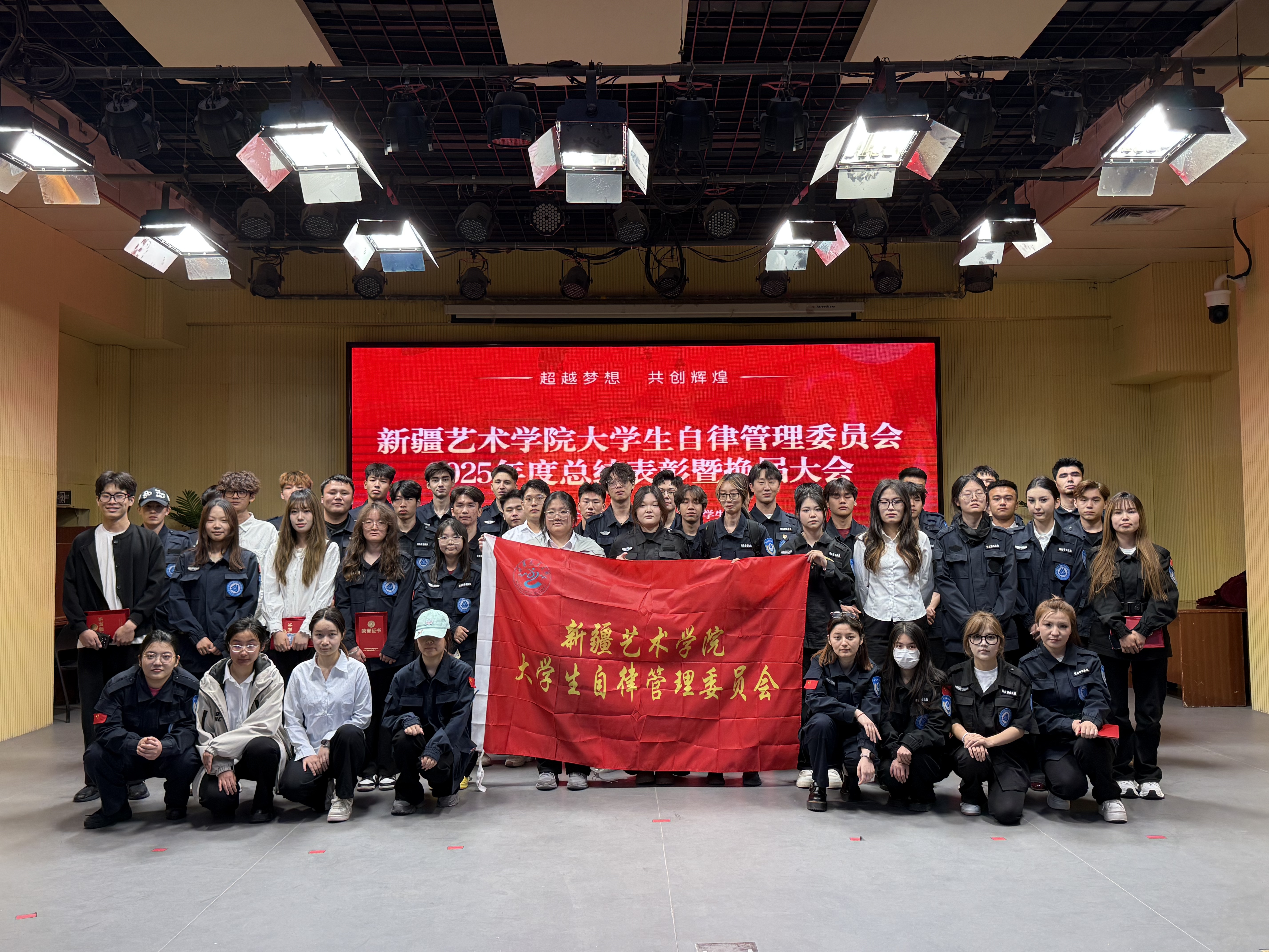 会议在全体参会人员的合影留念中圆满结束。此次会议不仅表彰了优秀,完成了新旧交替,更凝聚了人心,激发了全体成员的责任感与使命感,为新疆艺术学院大学生自律管理委员会工作持续的顺利开展奠定了坚实基础。