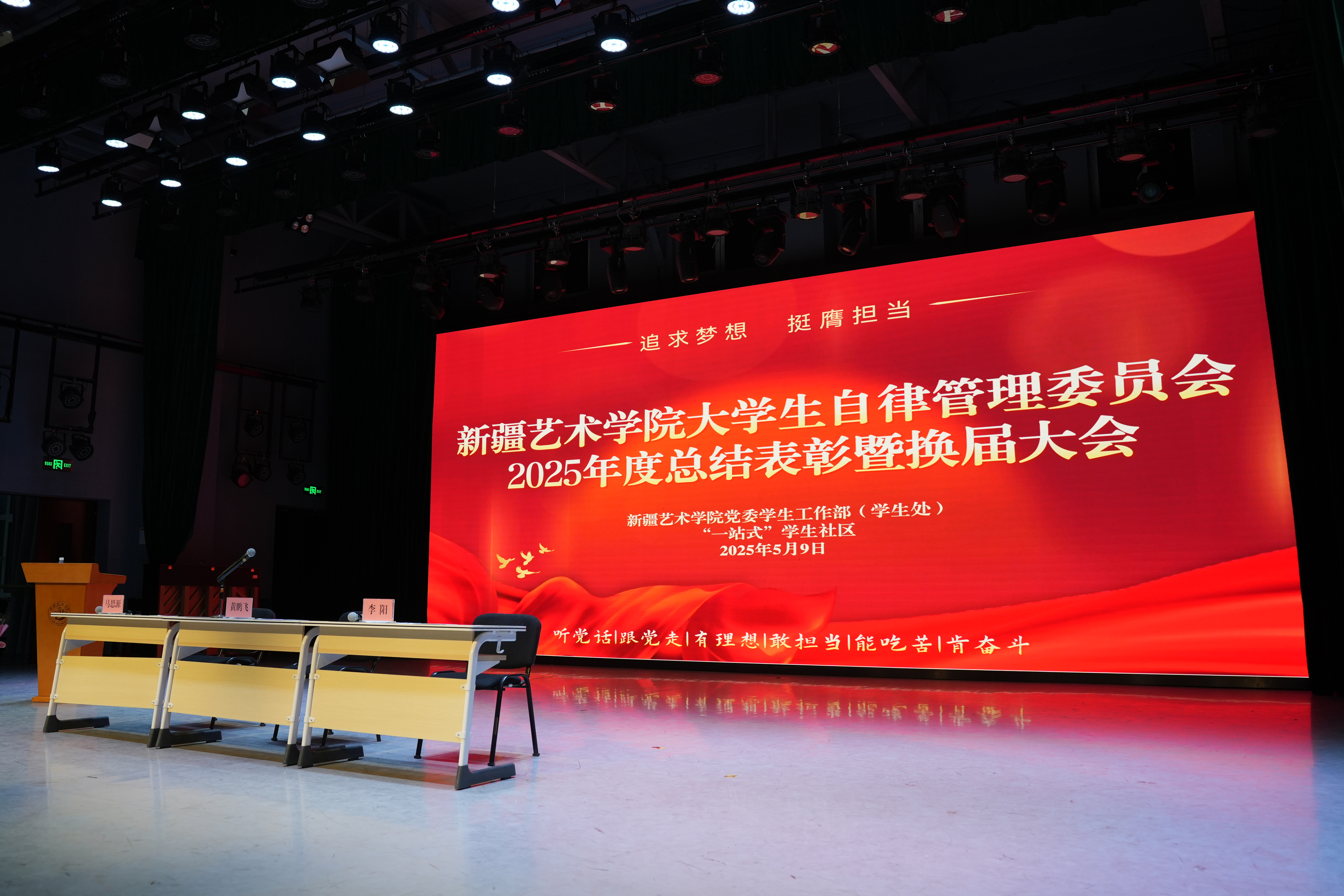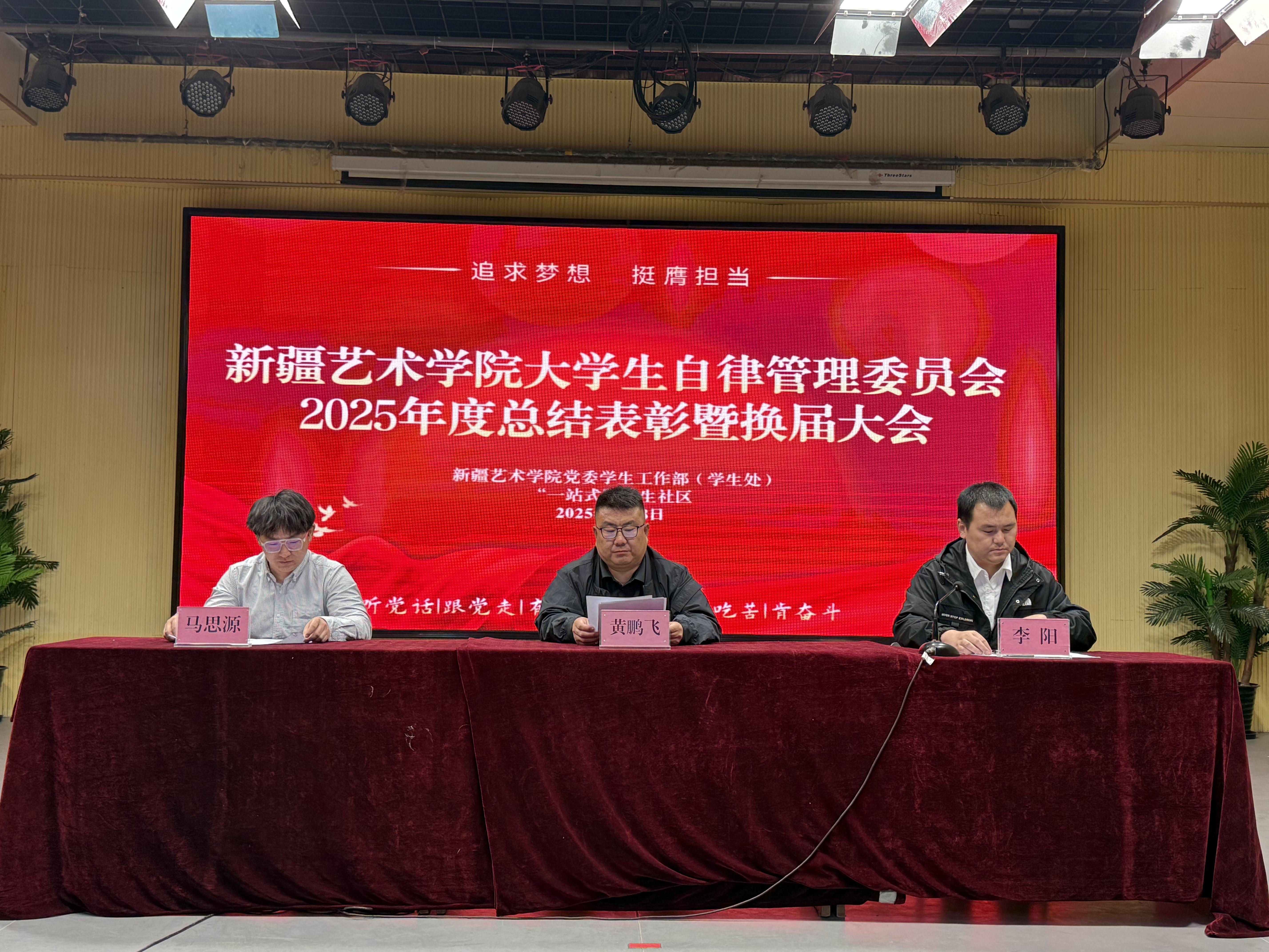 2025年5月8日、9日,新疆艺术学院大学生自律管理委员会分别在两校区开展2025年度总结表彰暨换届大会。“一站式” 学生社区专职辅导员、各学院辅导员、大学生自律管理委员会全体成员、各学院受表彰学生及名誉副主任齐聚一堂,共同见证这一充满荣誉与传承的时刻。
