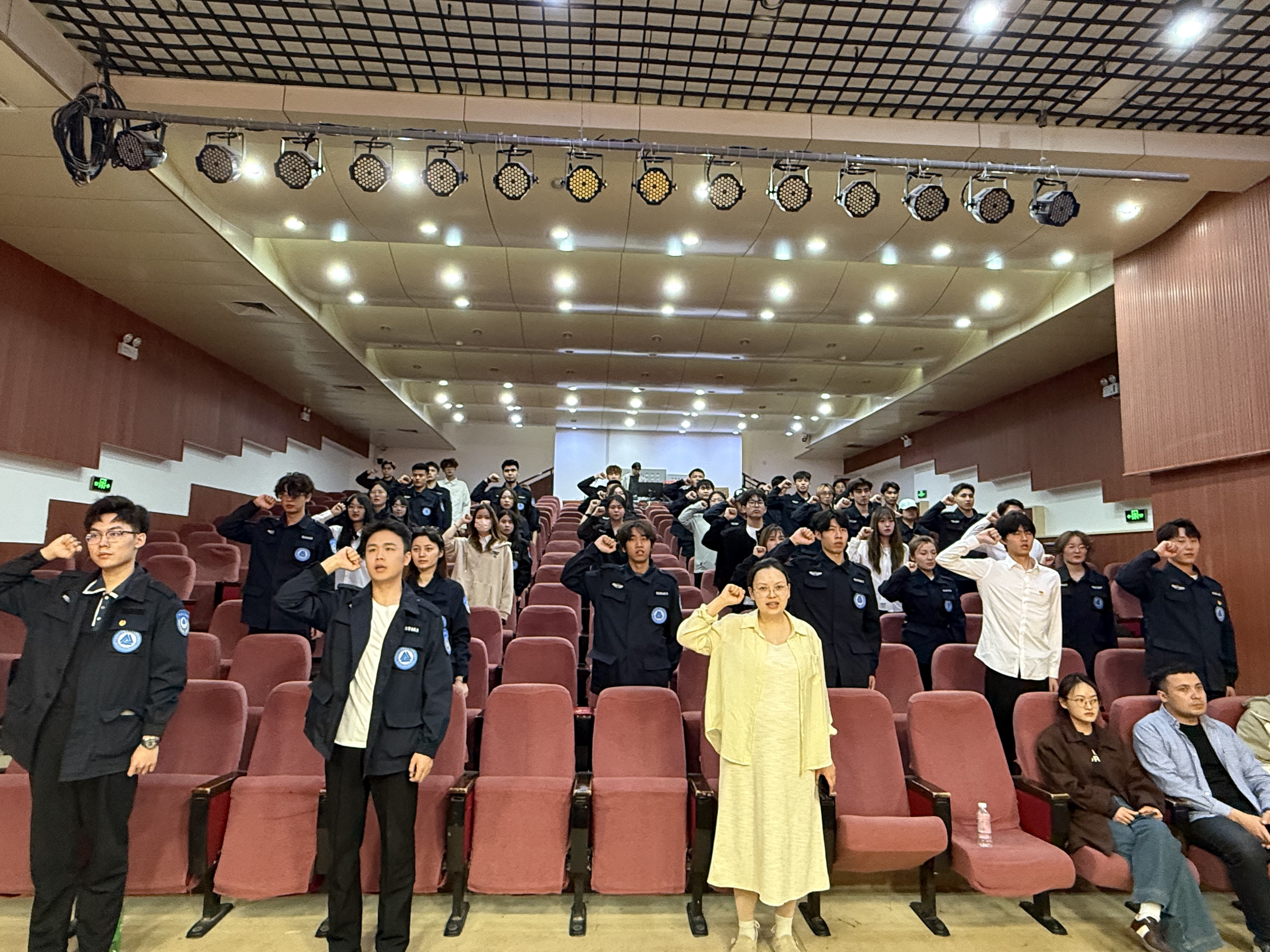 随着庄严的国歌奏响,全体参会人员肃立齐唱,激昂的旋律为本次会议奠定了庄重的基调。主持人随后向大家一一介绍到场的老师与同学,热烈的掌声在剧场内此起彼伏,展现出参会者的热情与期待。