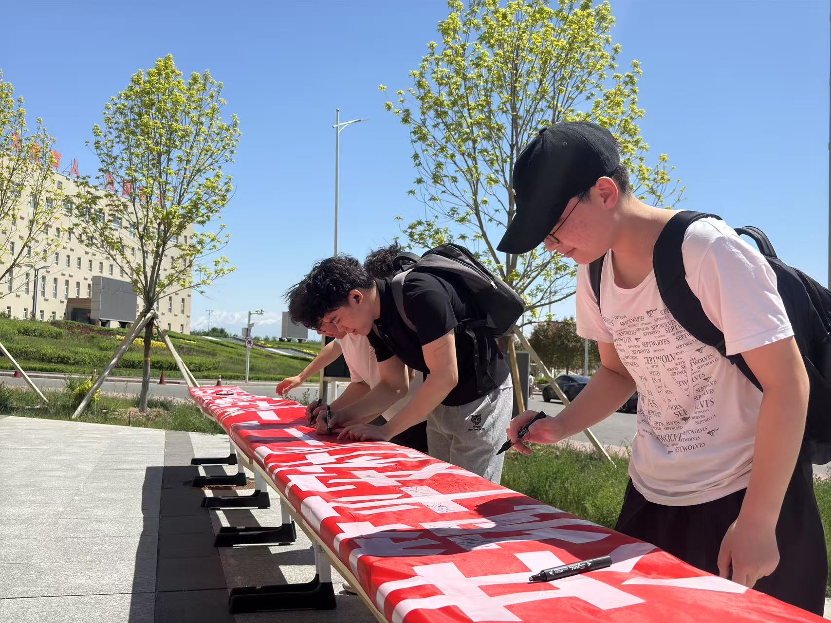 参加活动的同学在横幅上签名,庄严承诺从自身做起,杜绝使用违章电器,共同守护社区安全。