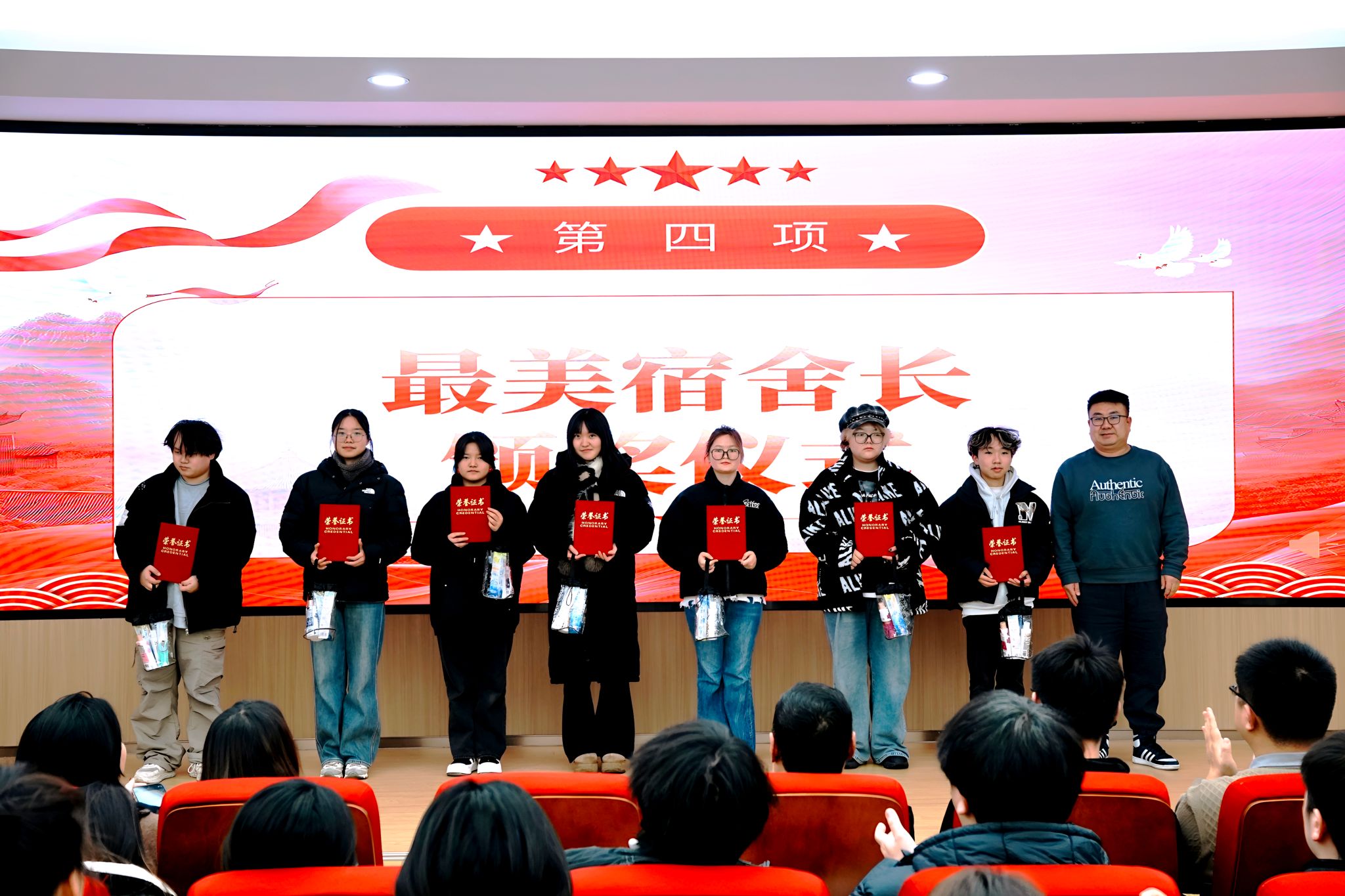 随后,马思源老师郑重宣读了《关于表彰2025-2026学年民族团结进步宿舍、 星级文明宿舍、最美宿舍长、最美宿管的决定》,对本年度在公寓学风建设、文明建设和安全建设中表现突出的宿舍和个人予以表彰。与会领导、老师为获奖集体和个人颁发荣誉证书及奖品。