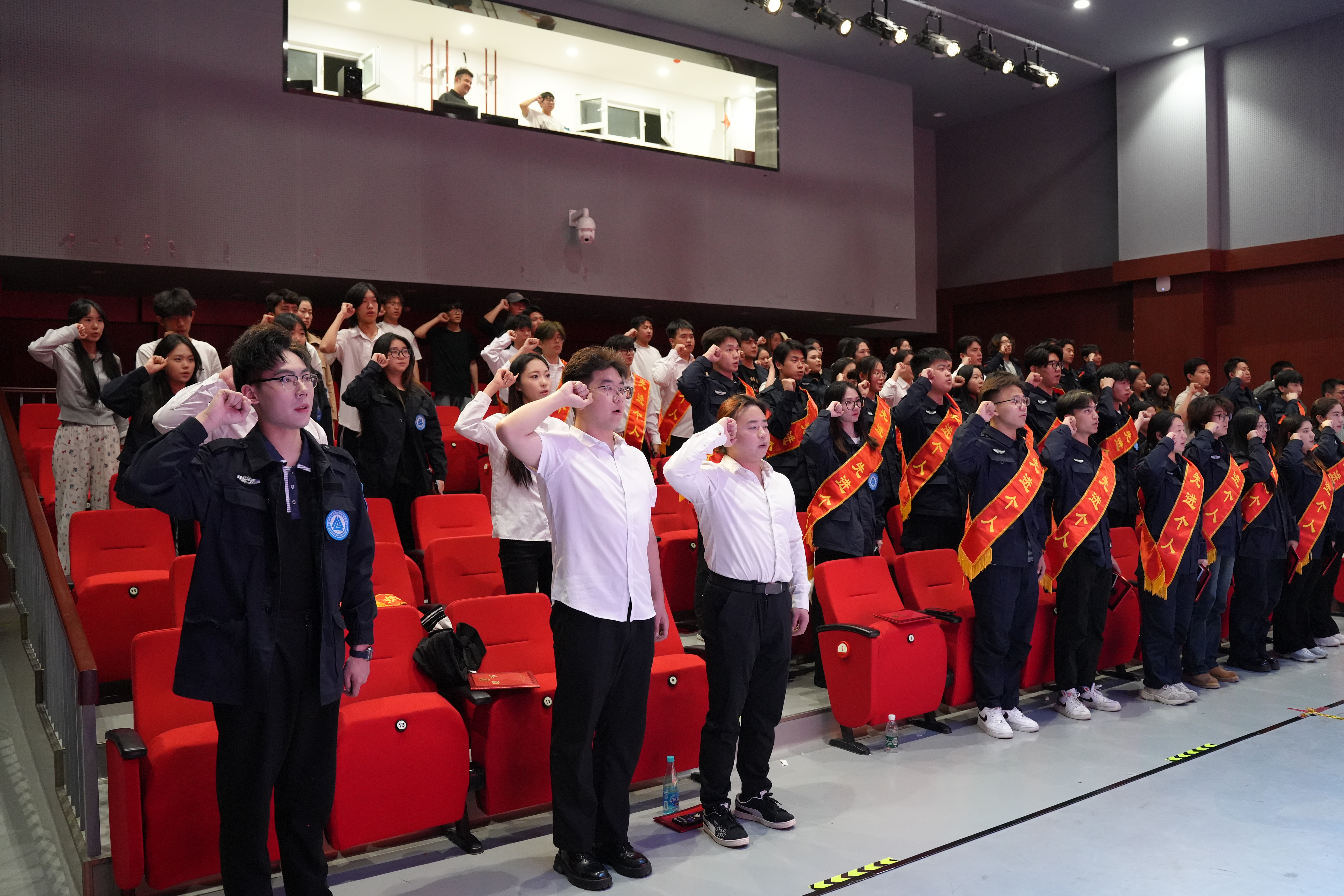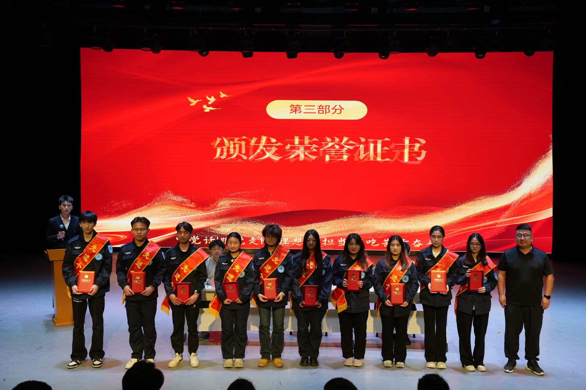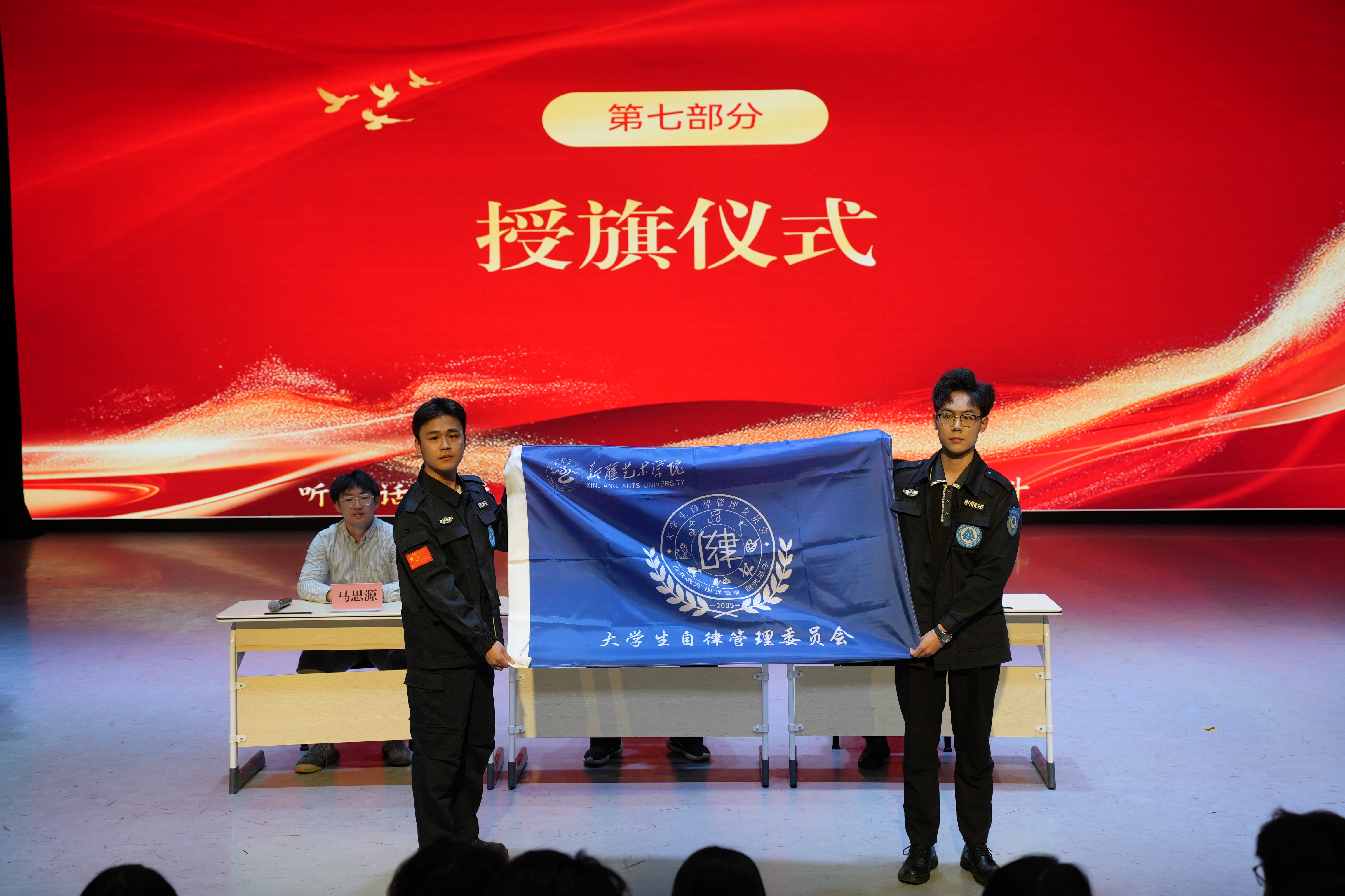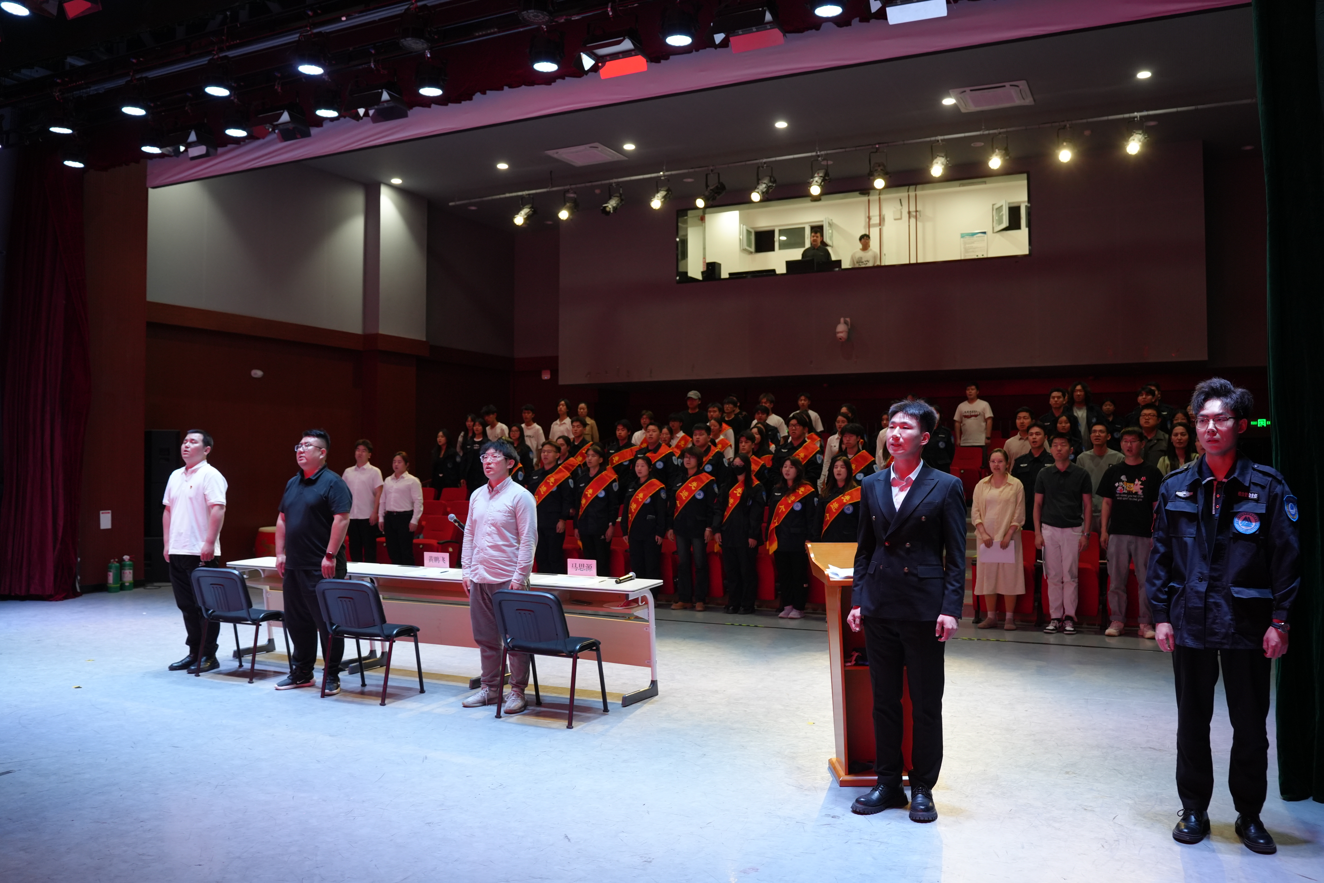上一届学生主任王俊斌上台发言,分享了自己在任期间的宝贵经验与深刻感悟,言辞恳切,饱含对自管会的深厚感情与美好祝愿。新一届学生主任海洋洋随后发言,他表示将不负众望,带领团队积极进取,为 “一站式” 学生社区建设贡献力量,并作为领誓人带领全体成员齐诵大学生自律管理委员会宣誓词,坚定有力的誓言回荡在剧场,展现出成员们为学生服务、为集体奉献的决心。